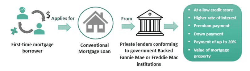How does a conventional loan work? First of all, an applicant requests a certain sum of money from a lender. To qualify, borrowers usually need to have a high credit score, a stable income, and a down payment (at least 3–20%). Private mortgage insurance is frequently required for loans with a down payment of less than 20%.