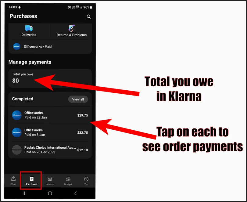 There are several ways to check your outstanding balance, but the most convenient method is through the app itself. Open it and go to the Purchases section.