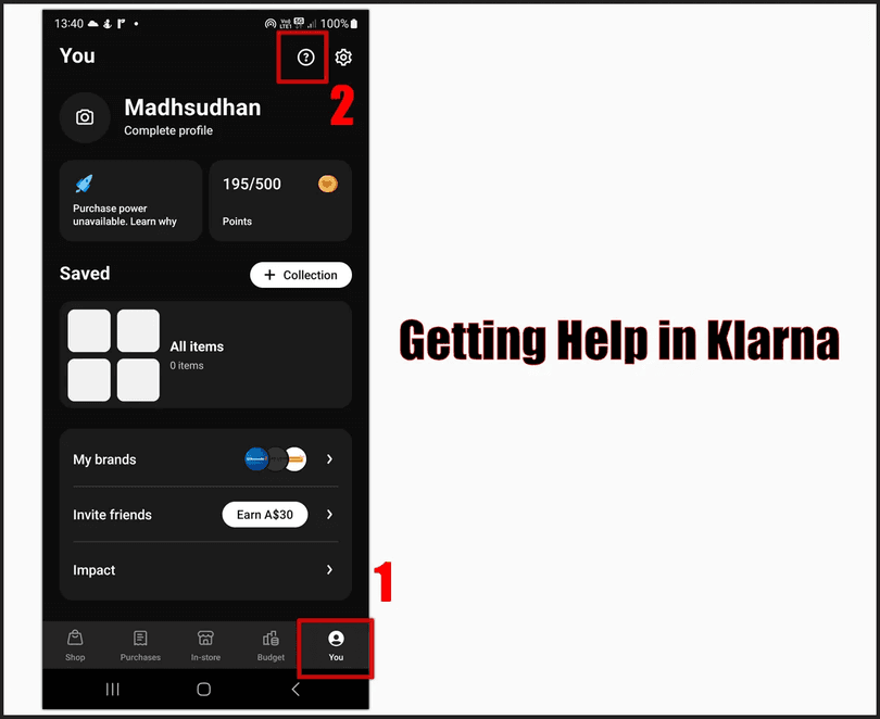 - Step 1. Launch the Klarna app and open the “You” tab. Next to the settings section, click the “Help” button.