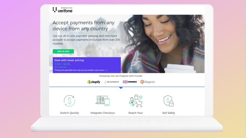 Verifone helps businesses receive online payments from bank cards in 200 countries and territories. In addition to payment processing, the service offers customers access to numerous shopping cart integrations for convenient checkout. The comprehensive 2Monetize pricing plan includes additional features such as account management, assistance with tax compliance, conversion optimization tools, and over 45 payment methods.