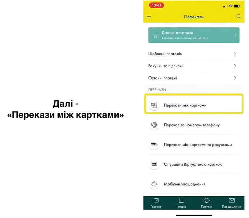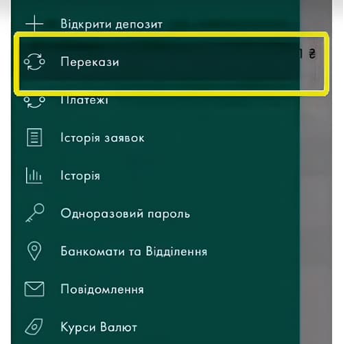 - Перейдіть в меню переказів та оберіть варіант платежу на картку.
