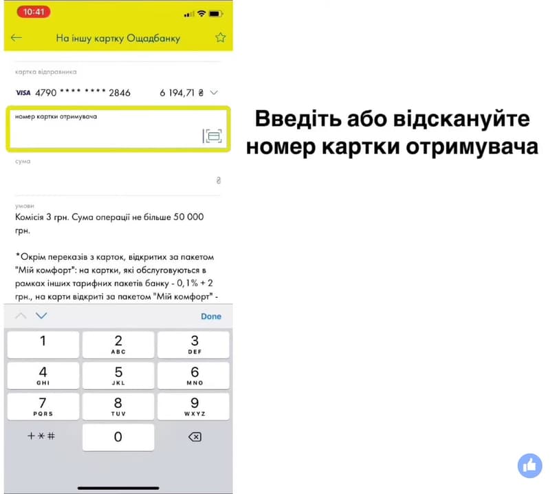 Якщо вам невідомий номер картки одержувача, скинути гроші з картки на картку Ощадбанку можна за допомогою опції «Переказ за номером телефону» для карток Ощадбанку. Також ви можете створити регулярний платіж для автоматичного перерахування коштів у зазначений час або створити шаблон, щоб у майбутньому не вводити повторно реквізити.