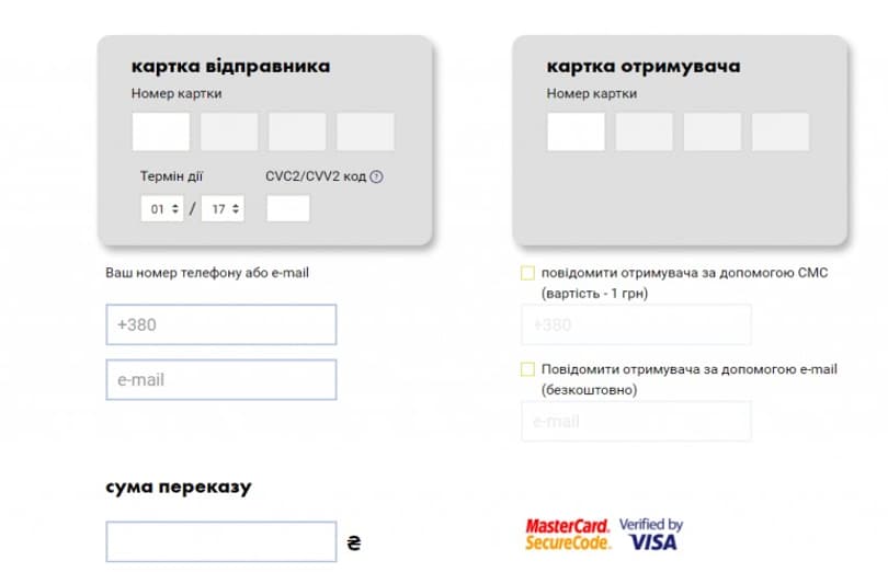 Транзакція виконується моментально, гроші надходять з картки на картку буквально за лічені хвилини.