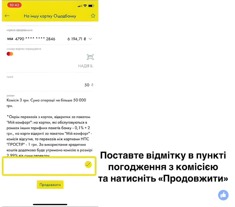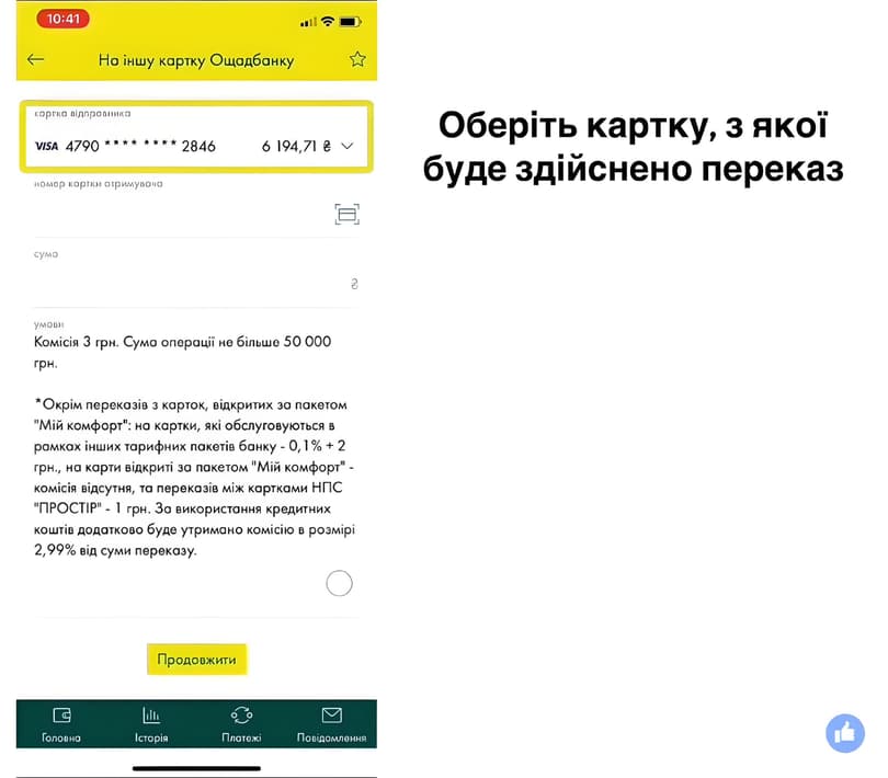 Кошти будуть списані з картки, яку ви використали для авторизації, звертайте на це увагу, якщо маєте декілька активних карткових рахунків. Таким чином можна переказувати кошти як між картками Ощадбанку, так і на картки, емітовані іншими установами. При цьому варто враховувати вартість такої операції, адже переказ з картки на картку без комісії доступний не в усіх випадках.