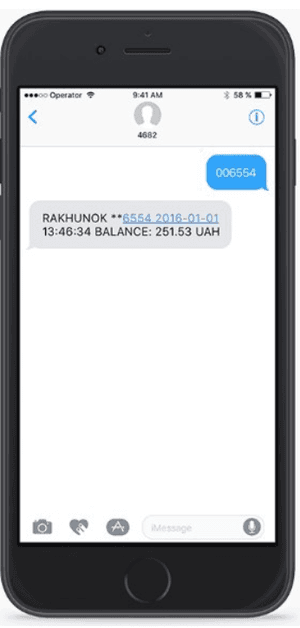 Для тих, у кого відсутнє стабільне підключення до мережі Інтернет, кому важко розібратись із використанням сайту або додатка, перевірити баланс картки можна і через смс-банкінг. Повідомлення будуть надходити щоразу після використання картки для оплати товарів чи послуг, але можливо і самостійно надіслати запит: варто лише відправити СМС з останніми шістьма цифрами вашої картки на номер 4682. У відповідь ви отримаєте повідомлення з актуальним балансом рахунку.
