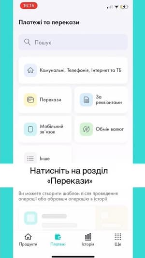 Перехід до переказів. В головному меню виберіть опцію «Перекази» або «Перекази між картами й рахунками», а потім «На картку іншого банку».