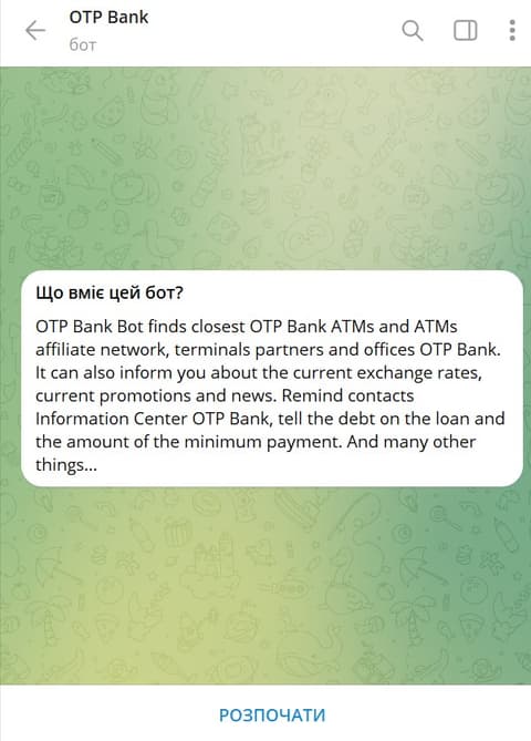 Якщо вам цікаво, як перевірити онлайн рахунок в ОТП Банку без додатка або використання банкомата, зручною альтернативою може стати чат-бот. Значною перевагою цього способу є те, що бот доступний для різних месенджерів (Telegram, Viber, Messenger) й скористатись ним можна зі смартфона, планшета або ПК.