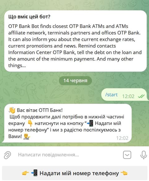 Для того, щоб чат-бот спрацював, необхідно надати номер телефону, який ви вказували під час відкриття рахунку в ОТП Банку. Перед тим, як перевірити стан рахунку ОТП, достатньо увійти з нього в акаунт месенджера.
