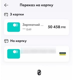 Оберіть з якої та на яку картку потрібно переказати кошти, введіть суму переказу.