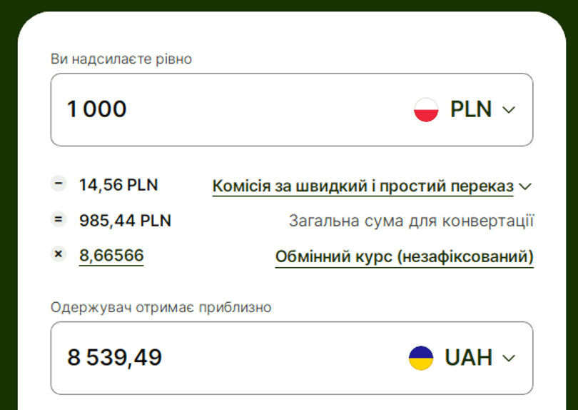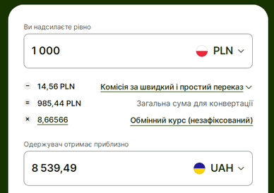 Комісія вказана за переказ суми 1 000 польських злотих.