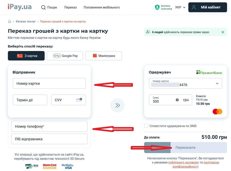 Вкажіть свій номер телефону та ПІБ, натисніть на «Переказати».