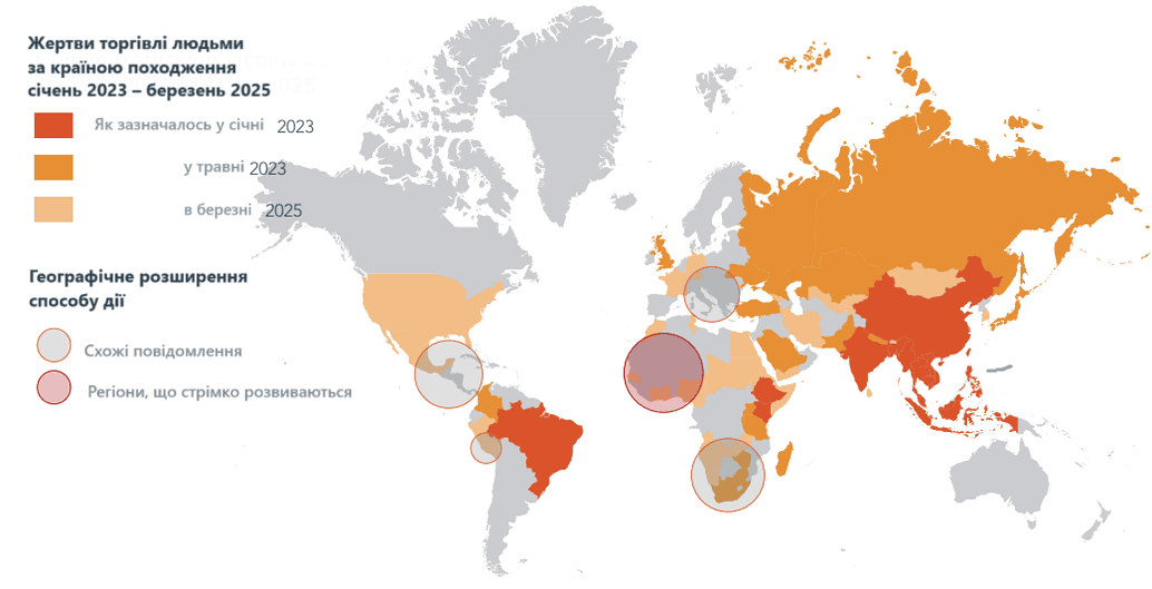 Почавшись у Південно-Східній Азії, індустрія примусових «центрів» із сотнями/тисячами «операторів» розповсюдилась до Близького Сходу, Африки, Центральної Америки. Станом на березень 2025 року зафіксовано жертв із 66 країн. Інтерпол кваліфікує це як «подвійну» шкоду: торгівля людьми + масові фінансові втрати постраждалих у всьому світі; також зростає використання ШІ у вербуванні та соцінженерії.